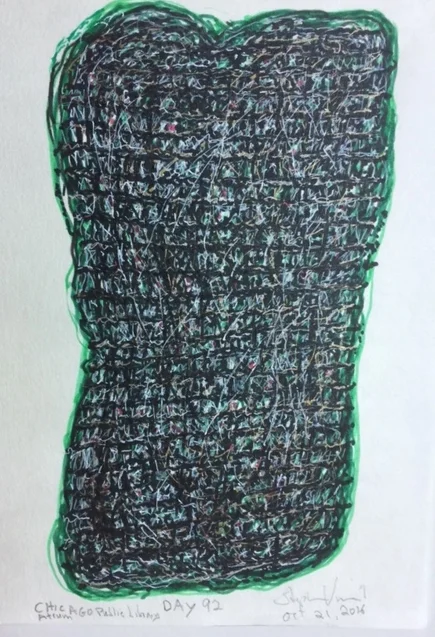 There is a wedding on the Ninth Floor under the skylight in the atrium. No. It is a rehearsal. The couple has “booked” the Library in a space without books. There is no music. The only music I hear is the sound of the pens exploring the paper as I draw. The artist as musician making marks responding to the voice of the rehearsal mistress giving choreographic instruction to the gathered as to how to enter the atrium from the sides to variously gather in and about the couple to be married. Everyone seems in that ripe moment of imagining the event while, at the same time, studiously withholding them selves to make small talk about other moments in their various lives. Seated sporadically around the edges of the circle small children, as if a spontaneous chorus, clap and play “paddy-cake”.